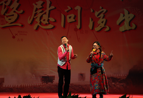 谐剧表演艺术家叮当的表演大受官兵及军属们的欢迎。图为叮当在现场表演谐剧《我的未来不是梦》。