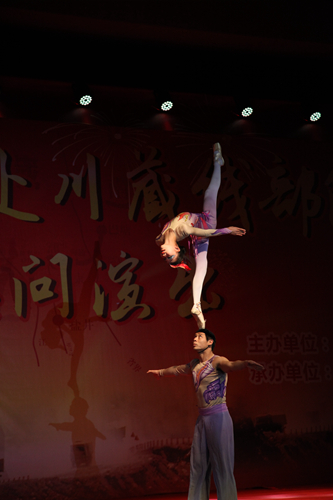 图为本次演出中的压轴杂技《肩上芭蕾》,其动作惊险,挑战极限,表演轰动全场。