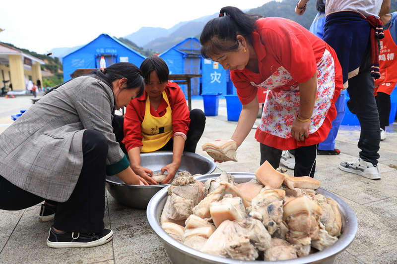 石棉县王岗坪乡安置点内,村民正在准备晚饭 黄刚/摄