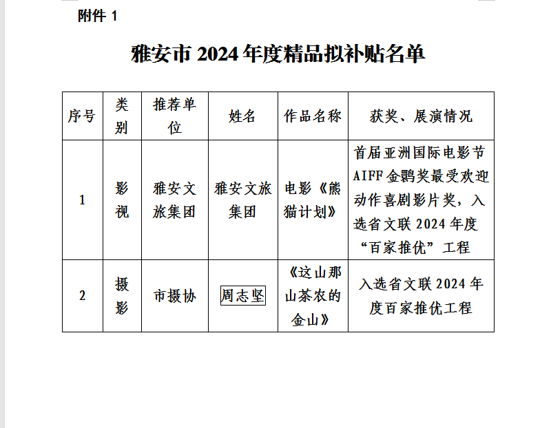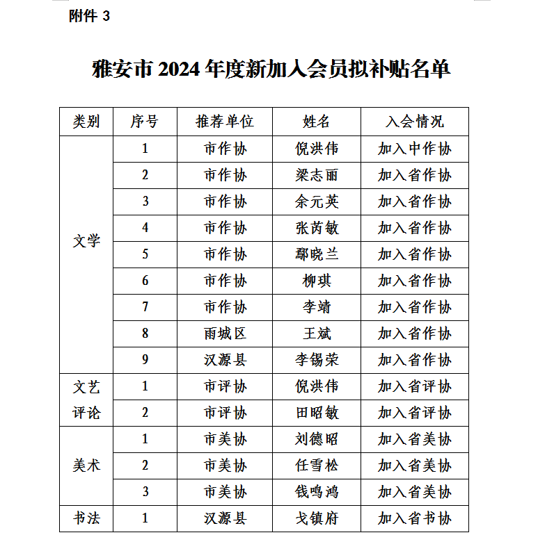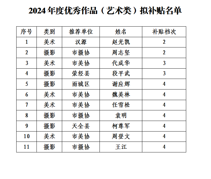 关于雅安市2024年度优秀文艺作品及会员补贴结果的公示